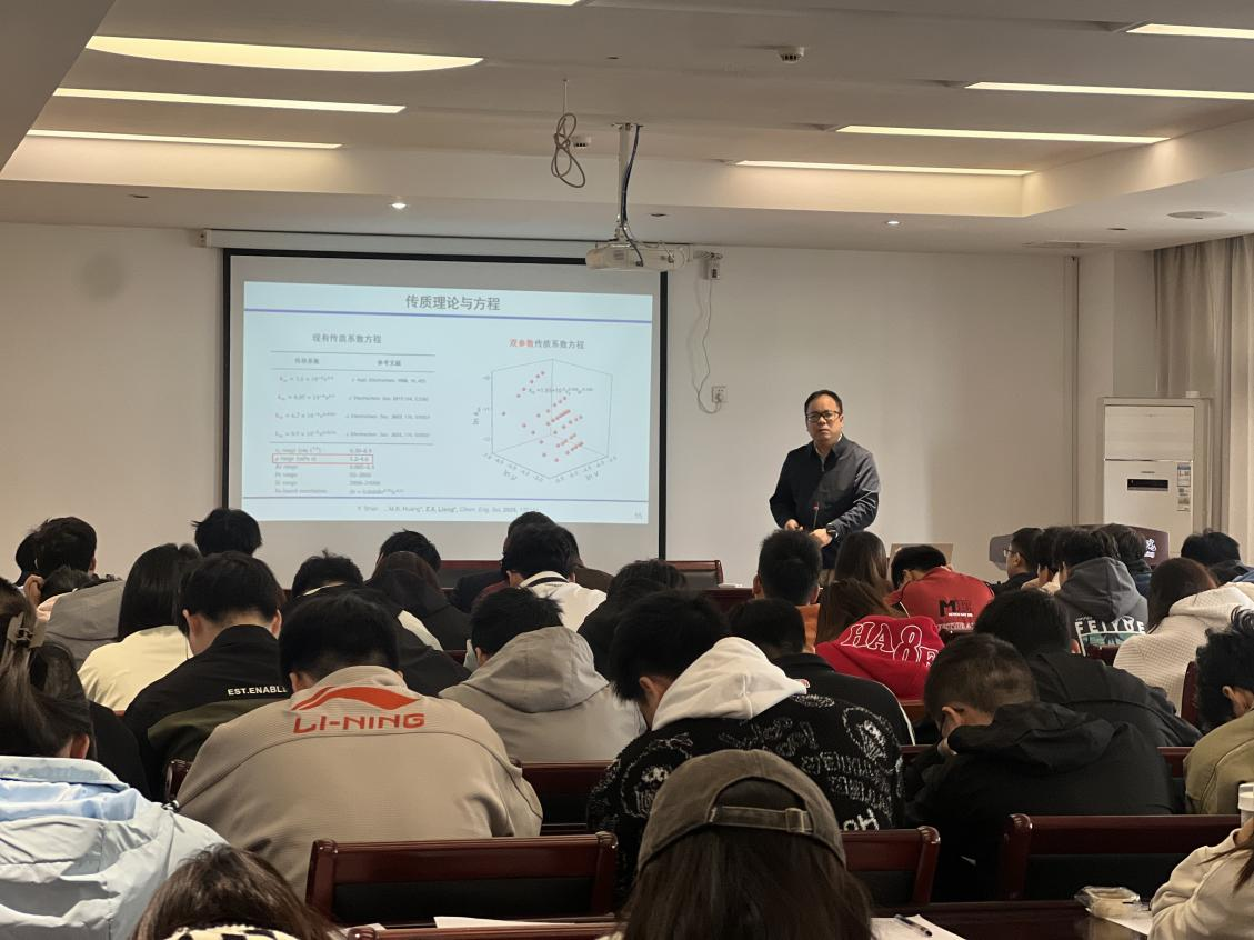 随后,华南理工大学梁振兴教授以《水系有机液流电池》为题,围绕新能源存储领域的关键技术突破进行讲解。梁教授指出,水系有机液流电池因安全性高、成本低、环境友好等优势,成为大规模储能技术的重要发展方向。报告中,他详细介绍了电池体系的设计思路、电极材料的优化策略以及电池性能的提升方法,重点分享了团队在电解液稳定性、电池循环寿命改善等方面的创新成果。针对师生提出的“电解液离子传导效率优化”“规模化生产工艺” 等问题,梁教授逐一细致解答,为相关方向的研究提供了宝贵思路。