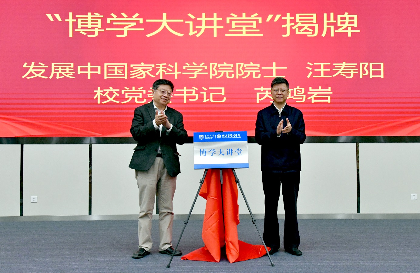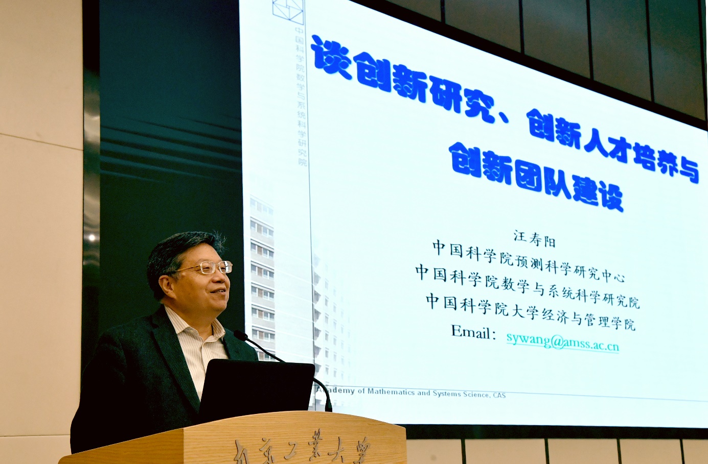 随后,汪寿阳院士与芮鸿岩书记共同为经管“博学大讲堂”揭牌。最后,汪寿阳院士做“博学大讲堂”第一期报告“创新研究、创新人才培养与创新团队建设”。他结合自己以及身边同事们在创新研究、人才培养和团队建设方面的切实经历,以活灵活现故事的形式给与会师生做了一场生动有趣的学术报告。