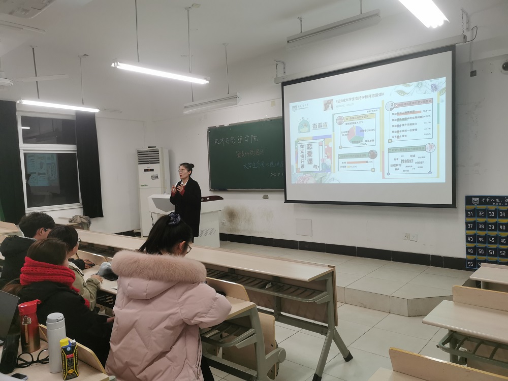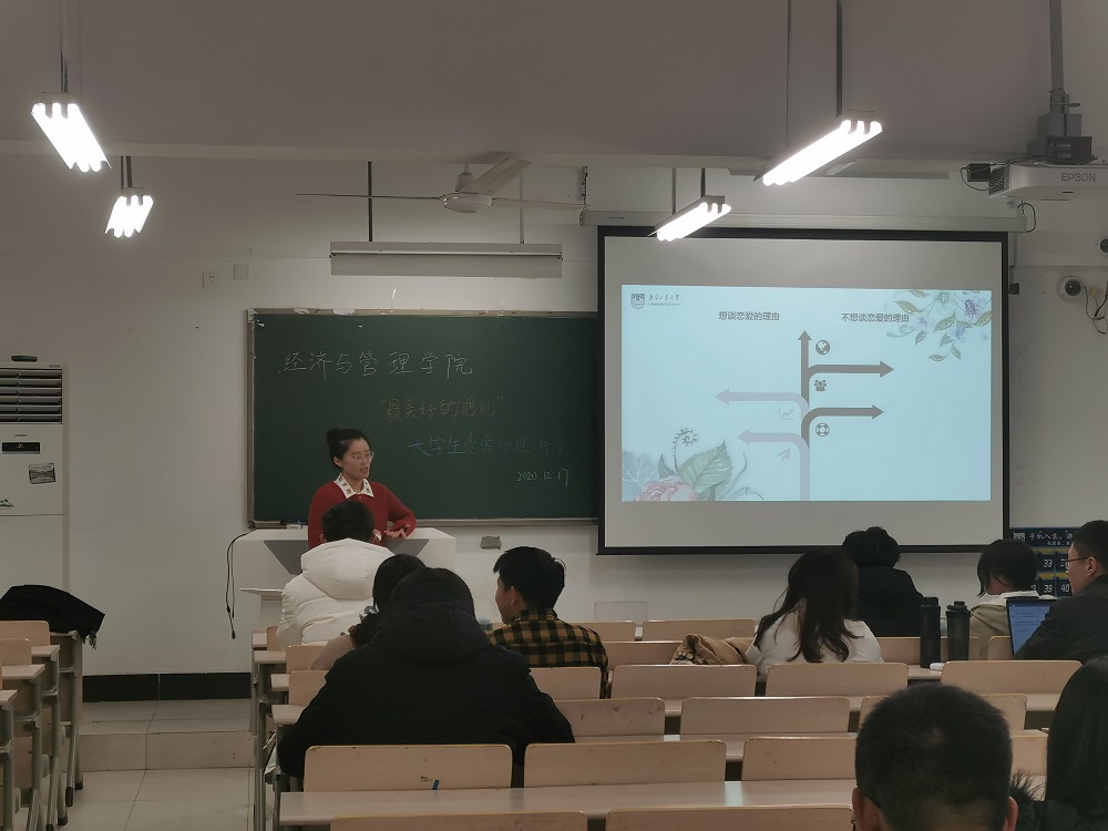 为扎实推进“三全育人”综合改革,创新心理育人模式,展现新时代高校心理健康教育的时效性,引导员工理性看待恋爱问题,切实加强和推进育德与育心相结合的心理健康教育工作。12月17日,经管学院心协在厚学206举办了“最美好的遇见”恋爱心理讲座。本次讲座邀请到bw西汉姆联心理健康指导中心的胡明慧老师作为主讲人。
