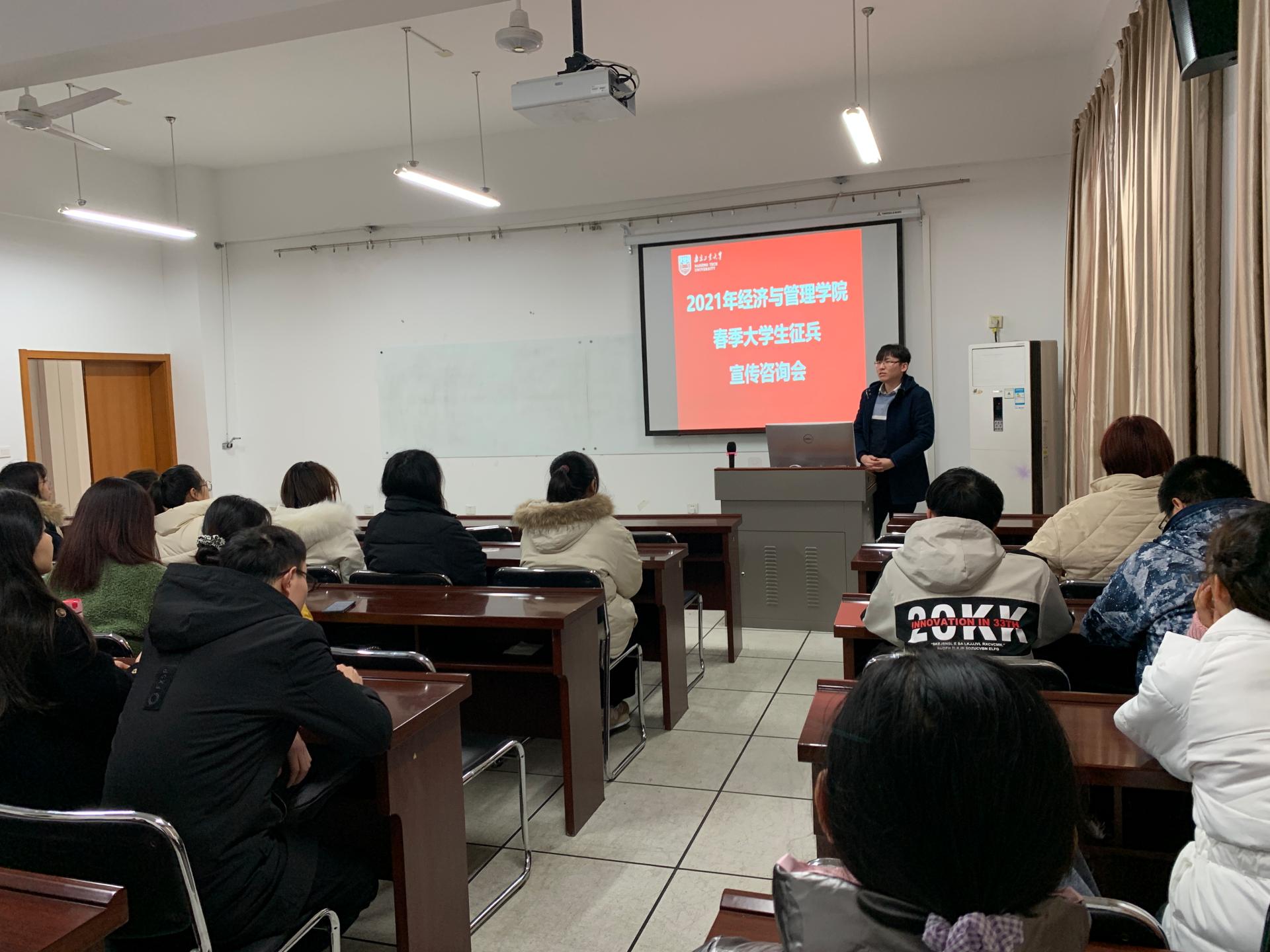 为激发老员工参军报国热情,进一步帮助员工了解、熟悉应征入伍相关政策和流程,切实做好学院2021年春季老员工征兵宣传工作。在学院征兵工作领导小组的组织协调下,经管学院于12月9日中午在博学楼622开展了老员工征兵宣传及政策解读活动,学院辅导员张宇豪为员工们进行了现场宣讲。
