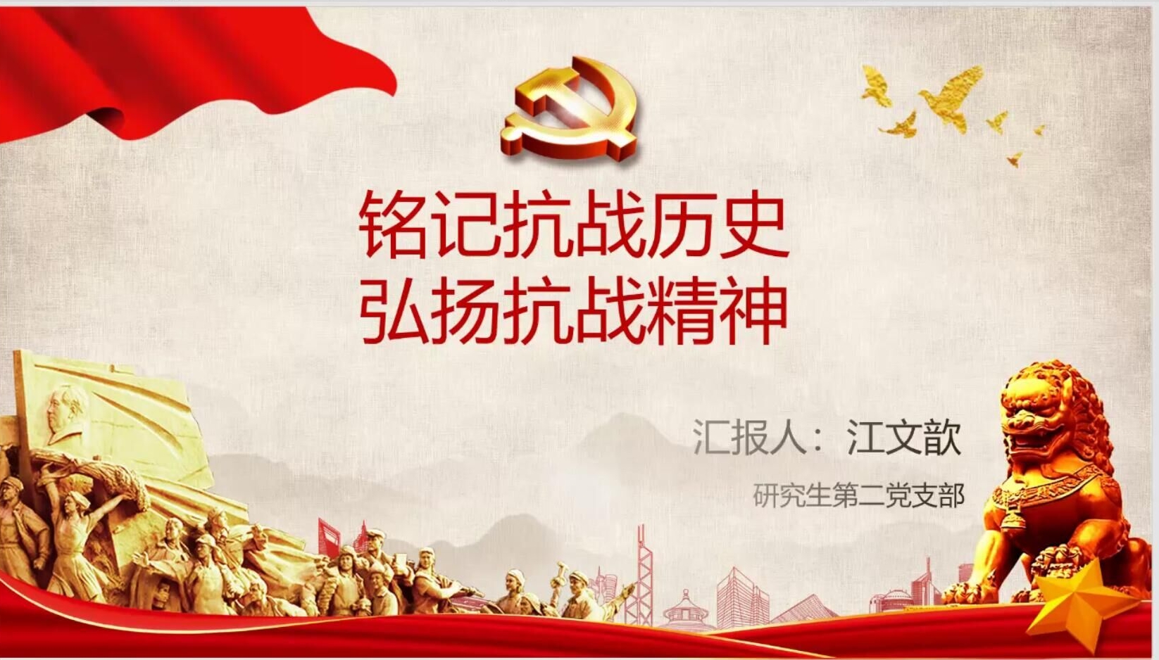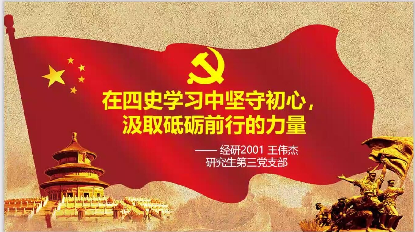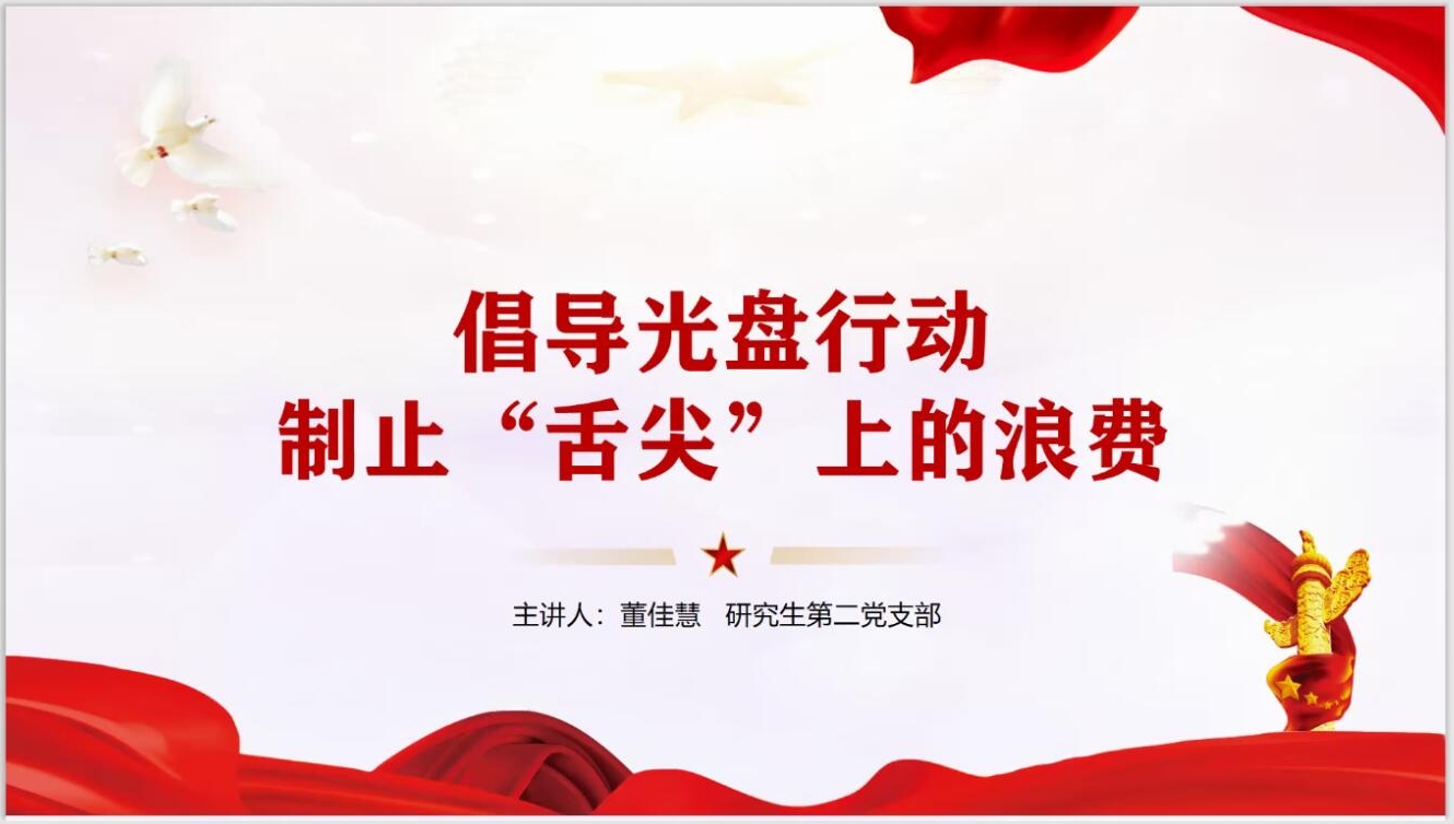 研究生第二党支部董佳慧、江文歆、郑玥皓和研究生第三党支部王伟杰四位同学,分别以“倡导光盘行动,制止‘舌尖’上的浪费”、“铭记抗战历史,弘扬抗战精神”、“中国青年有担当”和“在四史学习中坚守初心,汲取砥砺前行的力量”为主题展开演讲。首先,董佳慧同学分析了制止“舌尖”上的浪费的必要性,从思想、行为和制度层面分享了制止“舌尖”上的浪费的具体做法;然后,江文歆同学带大家回顾了抗战历史,从中总结出值得学习的抗战精神;接着,郑玥皓同学以抗“疫”中的青年事迹讲述了中国青年在祖国的建设事业中展现出来的责任担当;最后,王伟杰同学强调青年要不忘初心、牢记使命,在四史中汲取前行的力量。