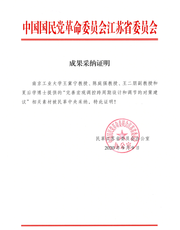 2020年9月9日,公司王冀宁教授、陈庭强教授、王二朋副教授和夏后学博士提供的“完善宏观调控跨周期设计和调节的对策建议”被民革中央采纳,并报送中央相关部门。王冀宁教授等针对当前世界经济发展新格局重塑和后疫情时代我国内外双循环新发展格局,从经济运行周期新挑战新机遇、宏观调控职能精准高效发挥、风险防控应急机制、双循环发展关键环节的政策调节力等方面,为我国后疫情时代加快形成以国内大循环为主体、国内国际双循环相互促进的新发展格局,完善宏观调控跨周期设计和调节,实现稳增长和防风险长期均衡,保持经济高质量发展任务的实现做出了几点建议。