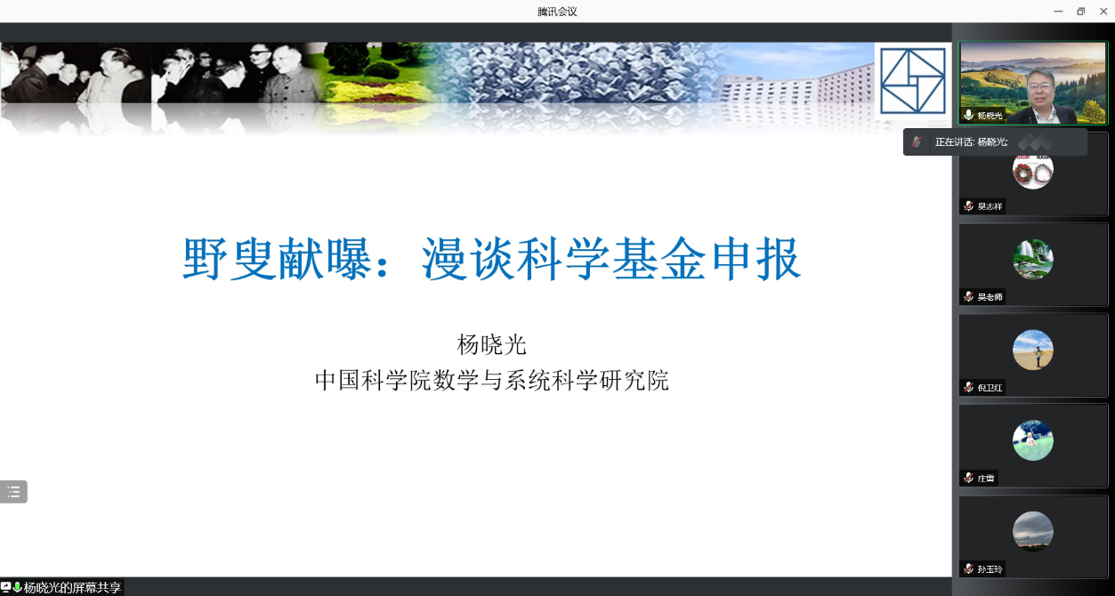 1月6日(周四)学院邀请中国科学院数学与系统科学研究院杨晓光教授,在线上做题为《野叟献曝:漫谈科学基金申报》的讲座。杨晓光教授的主要研究方向为金融风险管理与大数据挖掘、复杂网络和博弈分析,不仅主持了国家自科基金重大项目和国家社科基金重大项目等国家级课题数十项,亦是全国优秀科技工作者、中国青年科技奖、茅以升青年科技奖等多项荣誉获得者。杨教授以其丰富的经验,杰出的研究水准,为公司教师答疑解惑,也激励在场80来位研究生勉力前行。