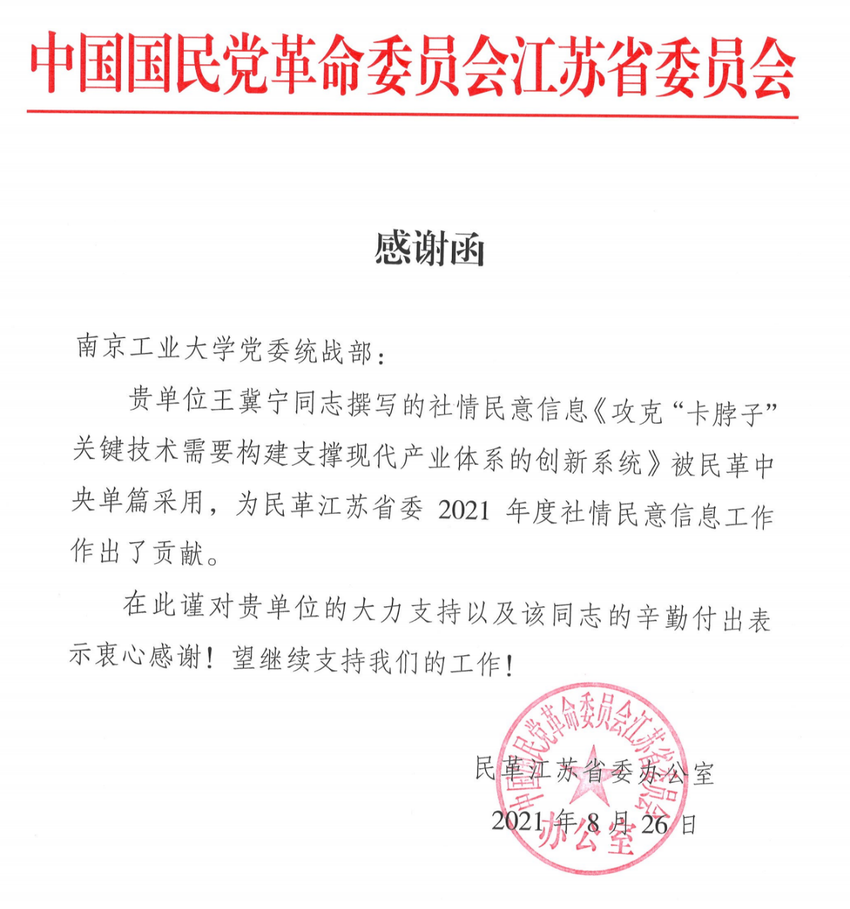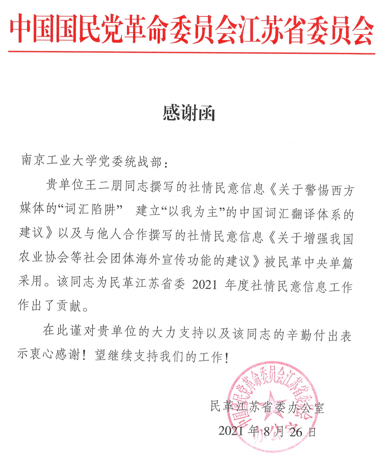 2021年8月,公司王冀宁教授撰写的《攻克“卡脖子”关键技术需要构建支撑现代产业体系的创新系统》、王二朋副教授撰写的《关于警惕西方媒体的"词汇陷阱"建立"以我为主"的中国词汇翻译体系的建议》和《关于增强我国农业协会等社会团体海外宣传功能的建议》分别被民革中央单篇采纳。