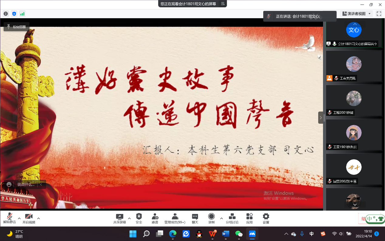 司文心同学带领大家从党史故事中探索真理、感悟初心使命。“落后就要挨打,贫穷就要挨饿,失语就要挨骂”,在复杂的国际背景下,司文心同学号召大家要担当时代责任,讲好党史故事,传播中国声音,让中国走向世界,让世界更加了解中国。