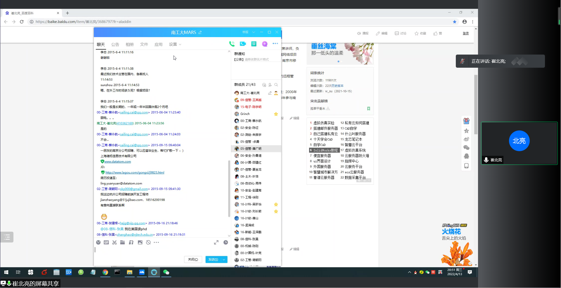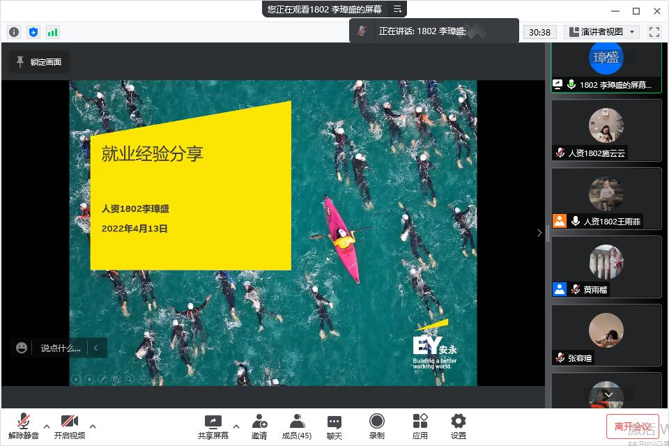 班级联系领导崔北亮结合自己的研究方向,推介了部分企业招聘信息,介绍了部分学长的成功求职案例,希望同学们端正就业观,结合自己专长寻找工作岗位,并予以积极帮助。凌红通过介绍陆建新等杰出员工的先进事迹,鼓励同学们主动谋求就业岗位,不要躺平,要和广大员工一起积极投入国家发展中去。