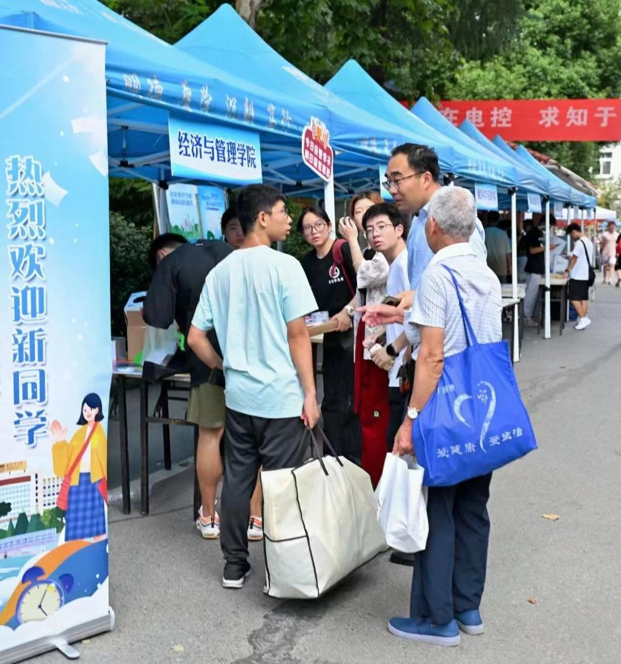 全院上下高度重视此次新生迎新工作,在学院领导下,精心组织、制订方案。报到日,院领导驻点指挥,公司党员先锋服务队、共青团先锋岗以及百余名志愿者分驻在迎新各点,有效分工配合,全力保证新生接待工作有条不紊地顺利进行。所有迎新人员全方位服务新生,为新生指路引路、搬运行李、答疑解惑,护航新生入校,让他们感受到了经管大家庭的温暖。无论是新生还是各位家长脸上都洋溢着快乐的笑容,对未来的生活充满期待。