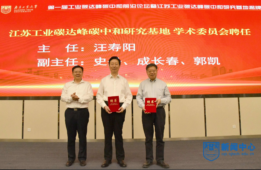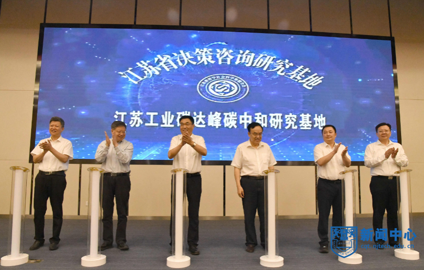刘西忠副主席宣读了江苏工业碳达峰碳中和研究基地认定文件。张来斌院士、汪寿阳院士、张新科书记、芮鸿岩书记、蒋军成董事长、张星副厅长为基地揭牌。张新科书记为基地首席专家蒋军成、汪寿阳、张星颁发聘书。党委副书记吴胜红宣读了基地理事会、学术委员会及研究机构的组成。蒋军成董事长分别为兼职教授、学术委员会委员颁发聘书并佩戴校徽。
