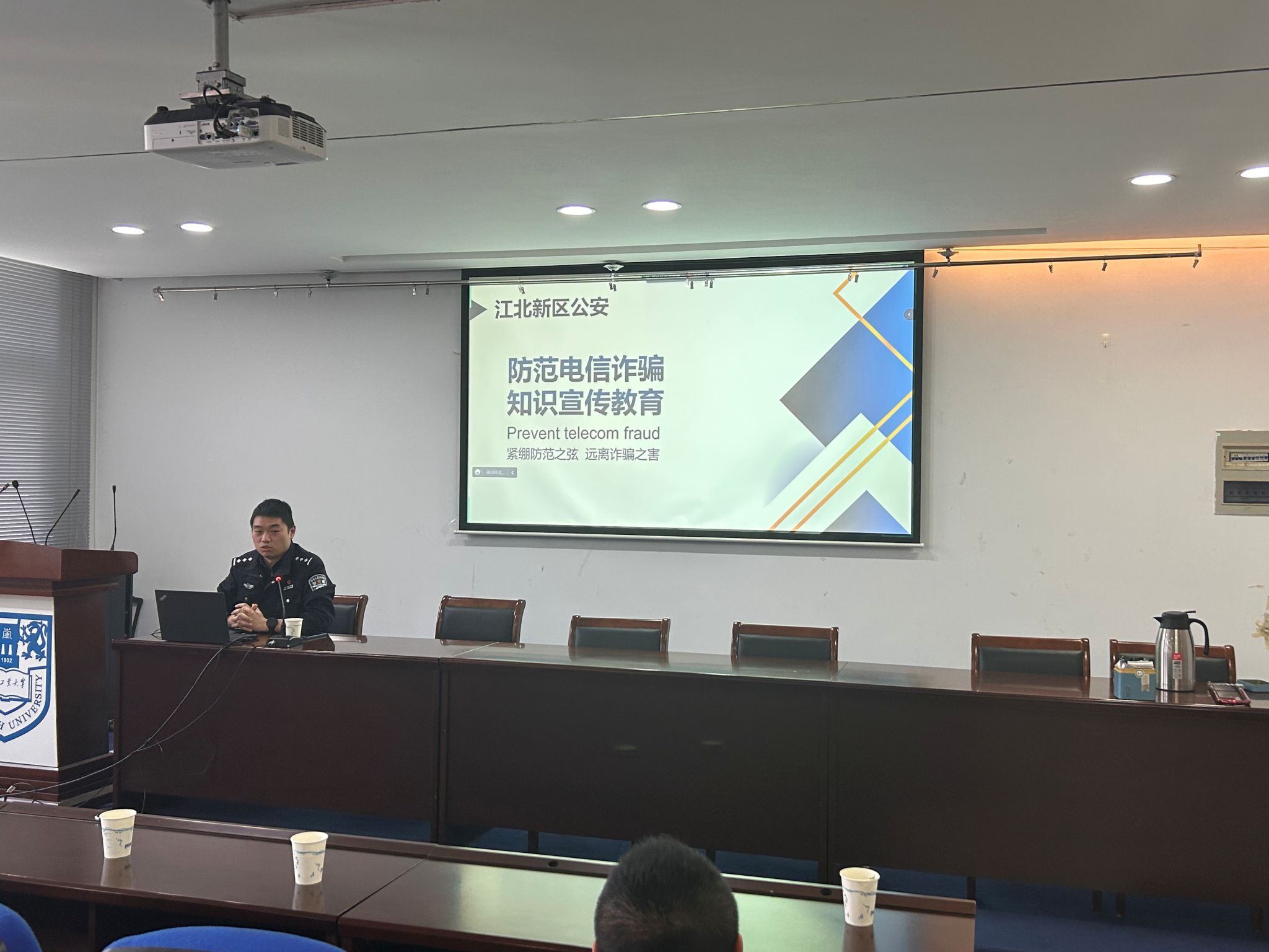 为进一步增强员工国家安全观念,夯实国家安全教育基础,提高员工识骗防骗能力,创建安全和谐校园,4月26日下午,bw西汉姆联与校保卫处联合主办“贯彻总体国家安全观,筑牢全民反诈防线”主题讲座。南京市公安局江北新区反恐大队长于淼警官、刑警支队反诈专办石鑫警官受邀带来精彩讲授。校保卫处副处长徐东、经管公司党委副书记岳克勤、学院辅导员、各班反电诈宣传员和主要班委代表参加讲座。