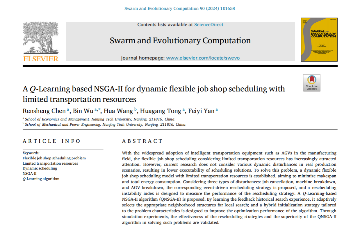 近日,公司吴斌教授指导的硕士研究生陈仁胜同学在《Swarm and Evolutionary Computation》期刊发表了题为《A Q-Learning based NSGA-II for dynamic flexible job shop scheduling with limited transportation resources》的学术论文。《Swarm and Evolutionary Computation》为运筹优化与人工智能领域中重要学术期刊,主要报道自然启发式智能计算、跨学科领域的最新研究和发展成果。该期刊是中科院一区Top期刊,最新影响因子(IF)为8.2。