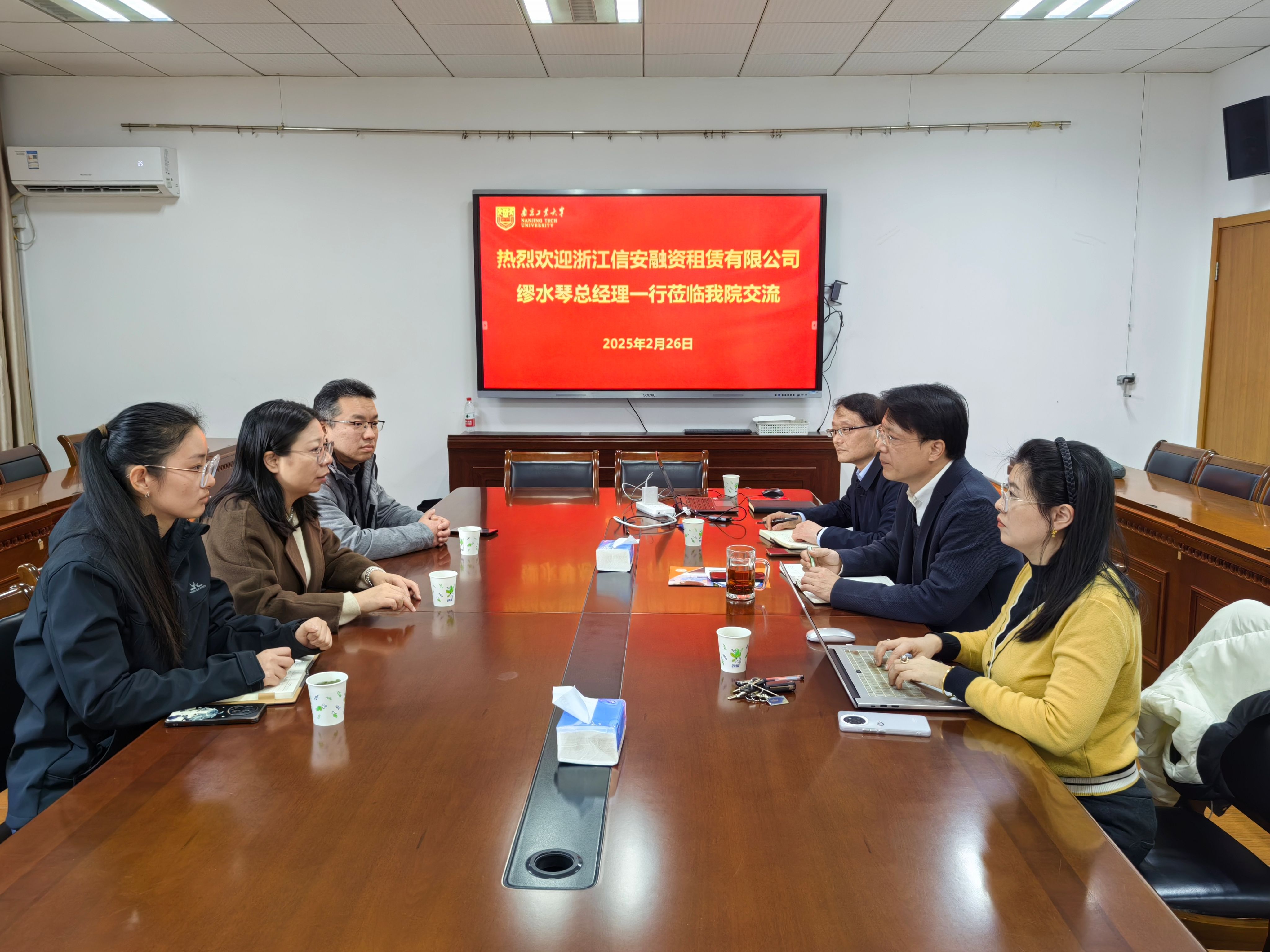 缪水琴总经理对公司的热情接待表示衷心感谢。缪总介绍了浙江信安融资租赁有限公司是衢州市首家国有全资融资租赁公司,业务涵盖融资租赁、租赁交易咨询、资产证券化及跨区域金融合作,累计发行ABS规模超11.51亿元。信安融资租赁与南工大已有相互合作的科研转化项目落地,为了适应公司业务发展和人才培养的需要,愿意与高校保持密切联系,进行多方面的校企合作。