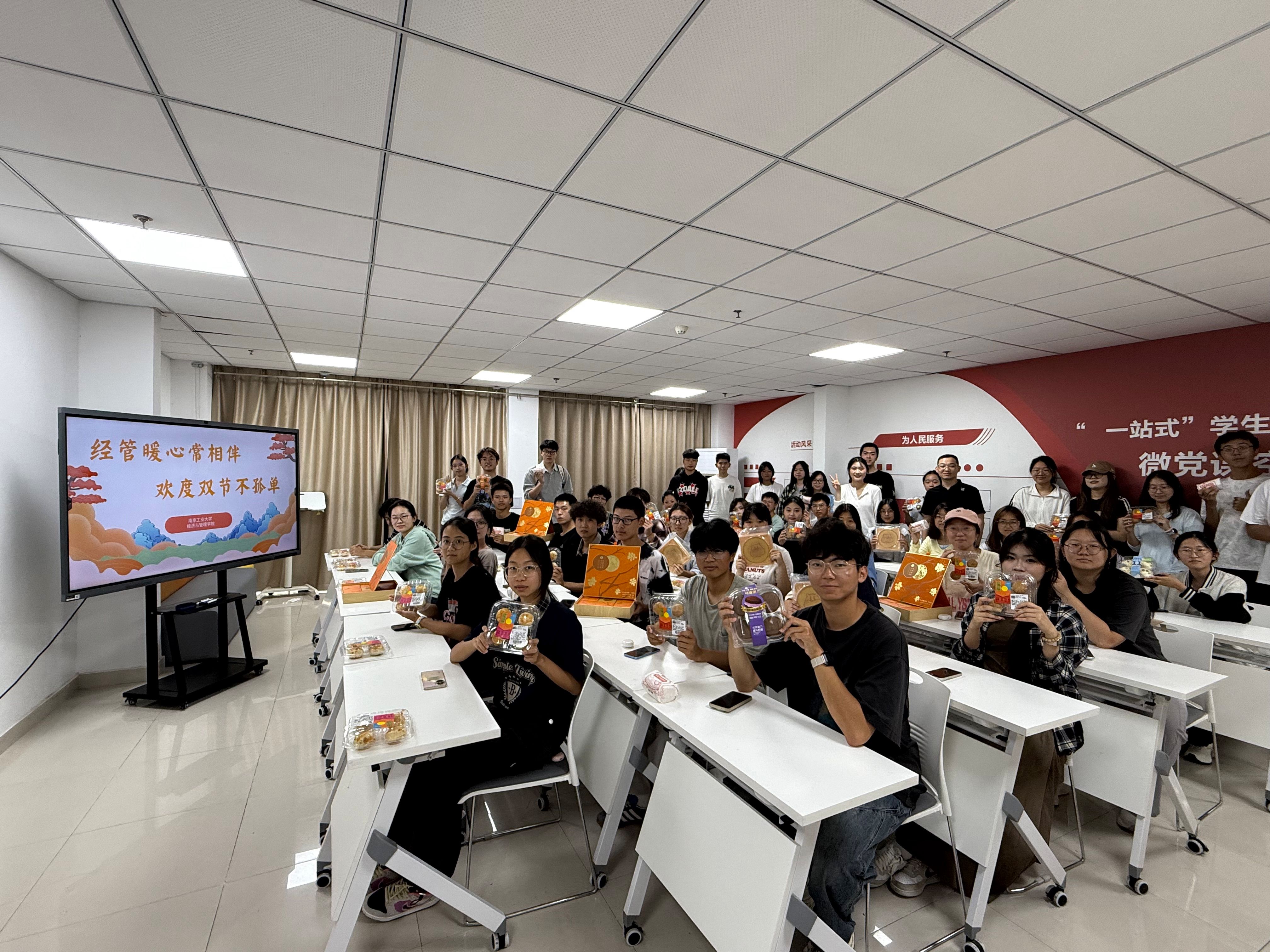 月满中秋,情满人间,但有部分新生第一次远行,不能和家人团聚。学院特在南苑一站式社区举办慰问活动。活动以“经管暖心常相伴、欢度双节不孤单”为主题,学院老师与留校员工代表一起欢度佳节。