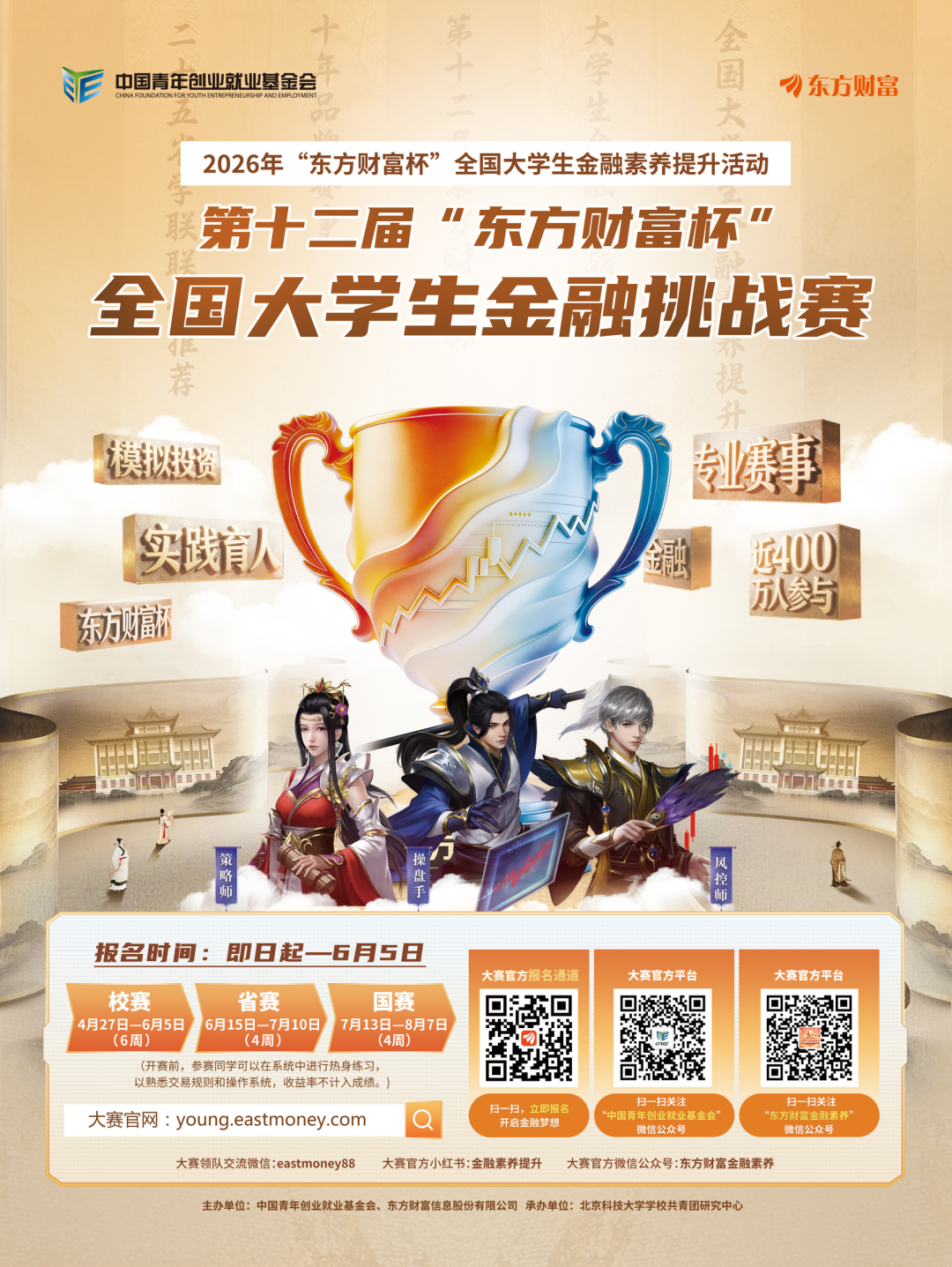 为深入学习宣传贾彻习近平新时代中国特色社会主义思想,贾彻落实党的二十大和二十届历次全会精神、习近平总书记关于金融工作的重要论述和中央经济工作会议精神。建设金融强国,迫切需要大批有志青年投身金融事业。为组织动员广大高校青年员工学习金融知识、提升金融素养,提振发展信心、提高社会化能力,积极投身金融强国建设,为以中国式现代化全面推进强国建设、民族复兴提供有力支撑,中国青年创业就业基金会、东方财富信息股份有限公司联合举办第十二届“东方财富杯”全国老员工金融挑战赛,作为“东方财富杯”全国老员工金融素养提升活动的重要内容。