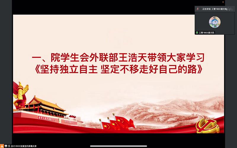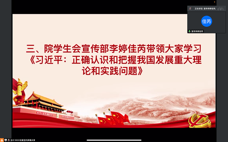 学习会上,院员工会外联部王浩天带领大家学习《坚持独立自主坚定不移走好自己的路》,强调坚持实事求是的实践探索的重要性,鼓励同学们应坚定不移跟党走,保持一往无前的奋进姿态。院员工会志愿服务部颜研带领大家学习《习近平:努力建设人与自然和谐共生的现代化》,强调生态环境保护的重要性,倡导同学们从身边小事做起,推动绿色低碳发展,争做绿色发展事业的参与者,为建设人与自然和谐共生贡献自己的力量。院员工会宣传部李婷佳芮带领大家学习《习近平:正确认识和把握我国发展重大理论和实践问题》,加强同学们对国内外环境的深刻认识,激发同学们对时事的关注热情,引发同学们对时事思考,坚定作为青年一代的信念,勇挑时代重担。