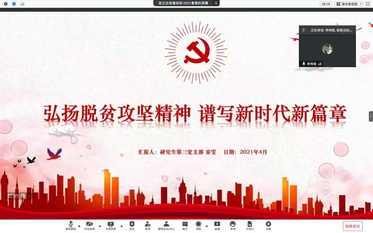 之后,秦雯同学以 “弘扬脱贫攻坚精神,谱写新时代新篇章”为主题展开演讲,从最开始的脱贫攻坚精神的由来讲到什么是脱贫攻坚及其深刻内涵,并且从党员干部、人民等角度多方位阐释了脱贫攻坚精神的重要意义。最后,秦雯同学讲述了作为当代老员工应该不忘初心,以人为本;勇于担当,诚恳实干;自强不息,英勇奋斗,传承弘扬脱贫攻坚精神。