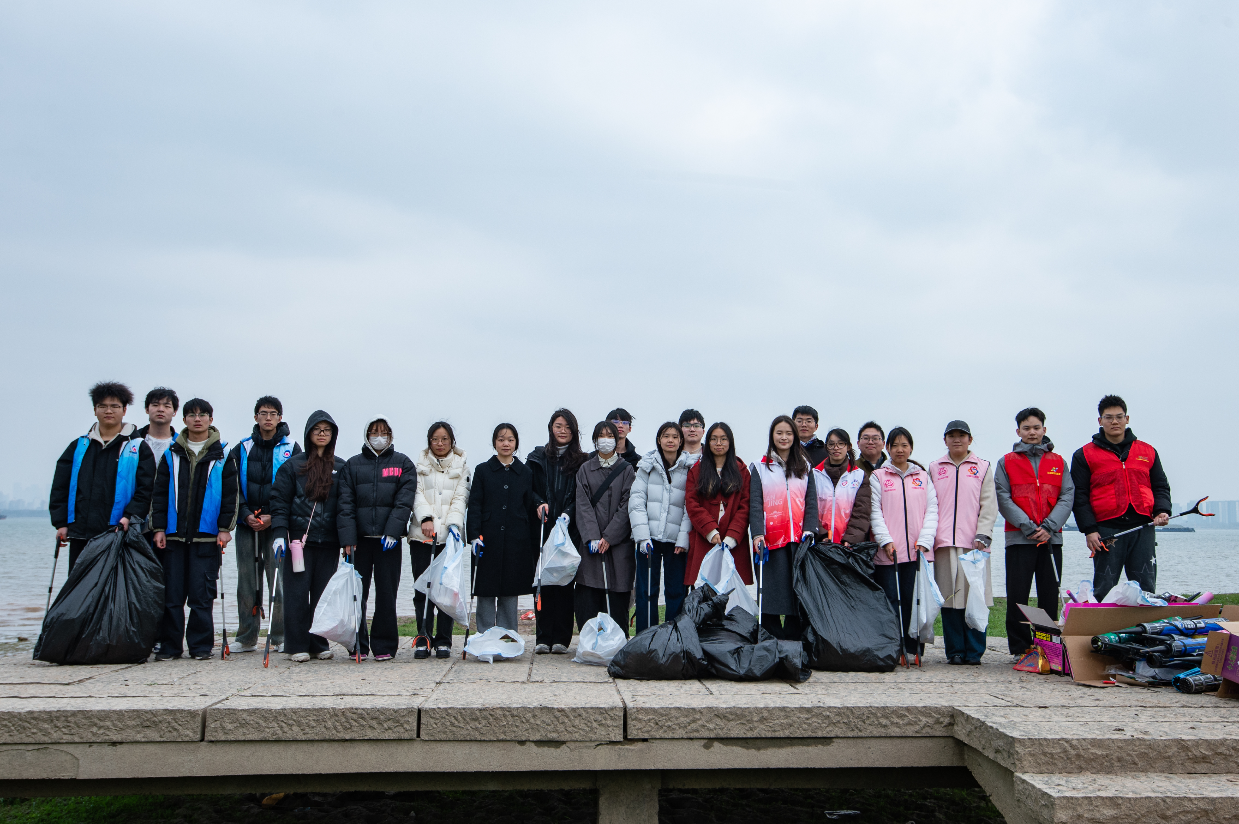 活动伊始,全体党员在闻涛广场集合,大家在短暂参观后合影留念,深刻感悟在新时代背景下传承和弘扬雷锋精神的重要意义。党员们纷纷表示,要将雷锋精神内化于心、外化于行,以实际行动为美化环境贡献力量。随后,党员们迅速投入到江岸垃圾捡拾行动中。大家手持垃圾袋和清洁工具,沿着江岸仔细搜寻,不放过任何一个角落。无论是隐藏在草丛中的塑料瓶,还是散落在岸边湿地上的烟头、纸屑,都被一一清理干净。部分同学表现尤为积极,不仅认真清理垃圾,还主动向周围的游客宣传环保知识,倡导大家共同守护美丽江岸。尽管江边风较大,但党员们热情高涨,分工明确、配合默契,充分展现了不怕脏、不怕累的奉献精神。