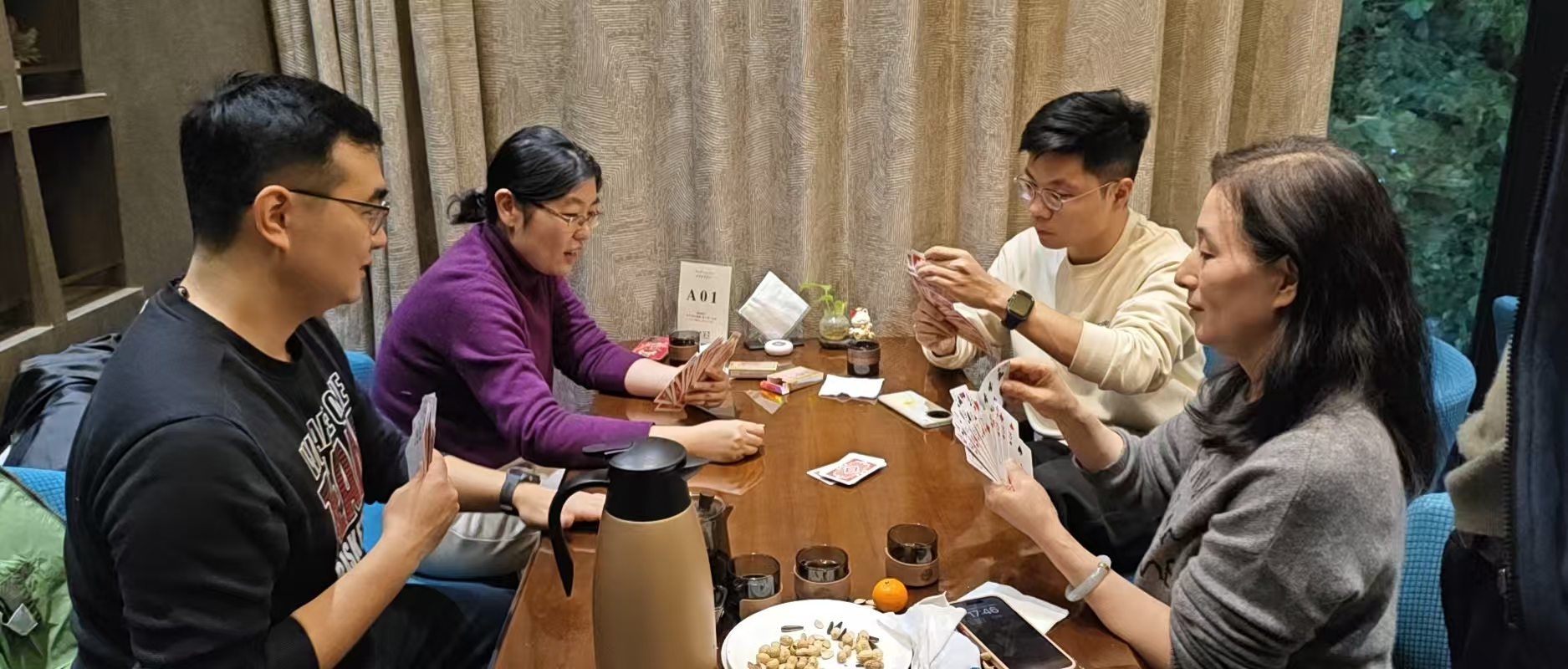 活动伊始,工会主席介绍比赛规则。随后,老师们自由组队、抽签对阵,迅速投入掼蛋比赛的智力交锋中。赛场上,搭档之间默契配合、沉着出牌,既有谨慎布局的深思熟虑,也有灵活应变的巧妙配合,展现了高超的牌技水准,更体现了团队协作的良好氛围。比赛结束后,大家移步茶话区,品茗交流,畅谈工作生活,在温馨互动中进一步加深情谊。